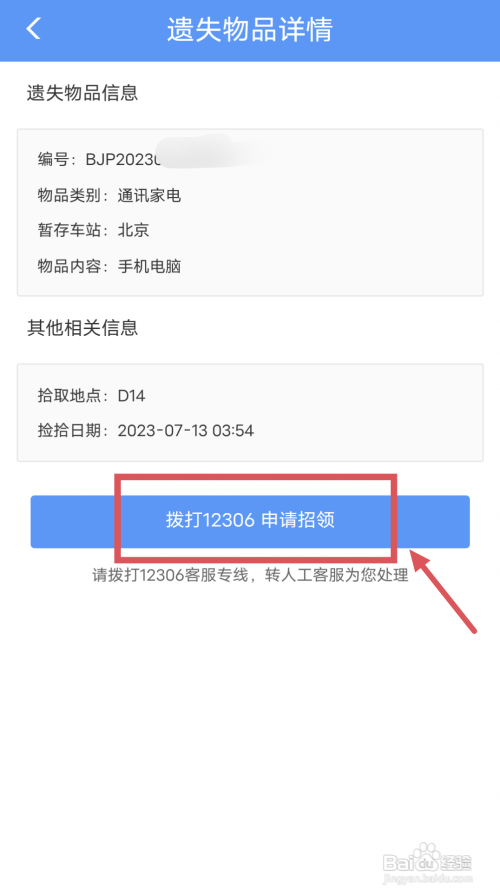 在遗掉物品详情页面,就可以看到详细时间点,再点击【拨打12306 申请招领】,到时找人工客服,描述相干详情,就可以找回了。
