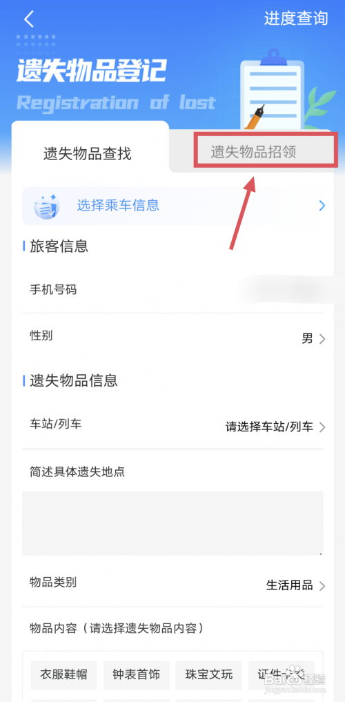 查询后,要是有人在车上捡到工具,上交挂号就会显示在这个页面,选择本身丢掉的物品。