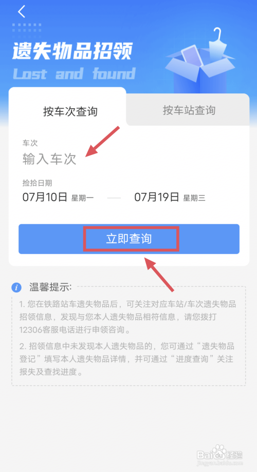 在遗掉物品招领页面,输入乘坐车次,再点击【当即查询】。