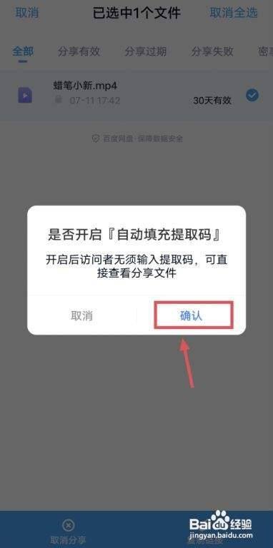 呈现"是否开启主动填充提取码"的对话框,点击"确认"。