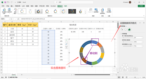 将饼图调小尺寸(小于内环),再按住【Ctrl】选中圆环图和饼图两个图表,点击【外形格局】-【对齐】-【程度居中】和【垂直居中】,这样图表就组合完当作。
