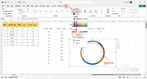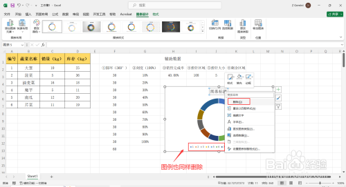 选中①圆环列数据单位格区域,点击【插入】-【圆环图】,在表格中插入一个圆环图,然后在圆环图中的"图表标题"和"图例"上单击鼠标右键,点击【删除】。