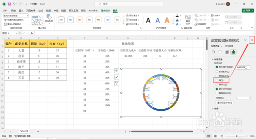 选中内圆环,点击图表右上方+号(图表元素),选择【数据标签】-【更多选项】,在弹出的"设置数据系列格局"对话框中,勾选【单位格中的值】,在新弹出对话框的"拔取数据标签区域"中输入:=Sheet1!$G$3:$G$12(即:拾取②刻度列数据单位格区域),然后点击【确定】,再将【值】取消勾选,封闭对话框即可。