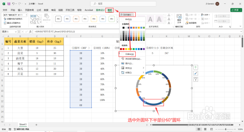 选中外圆环下半部门60°圆环,点击【格局】选项卡,然后点击【外形填充】-【无填充】,继续点击【外形轮廓】-【无轮廓】,将外圆环中60°圆环取消显示。