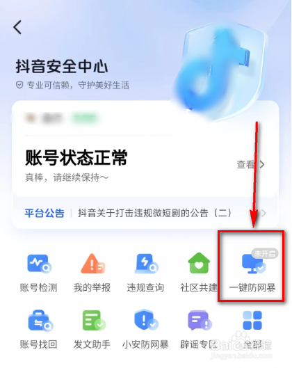 6.进入到抖音安全中间页面后,点击: 一键防网暴。