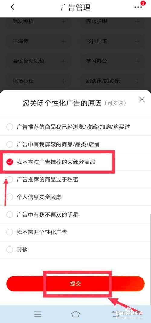 在封闭缘故原由选项,点击一个选项,再点击【提交】就可以封闭个性化告白保举了。