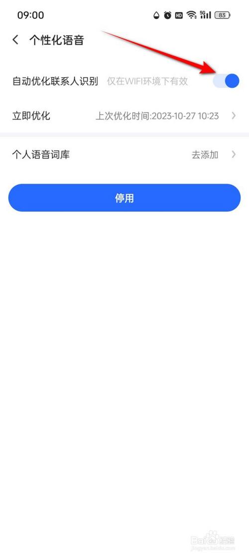 将"主动优化接洽人辨认"旁的小滑块点暗即可封闭,此时点击小滑块。