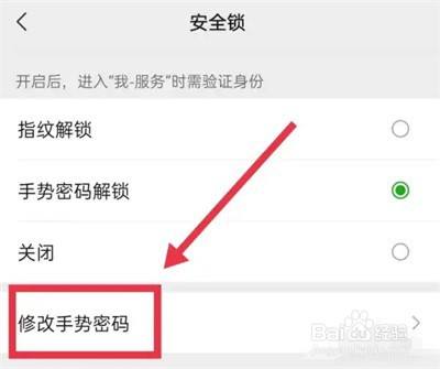 6.进入到安全锁页面后,在"修改手势密码"上面点击进入,按照页面提醒输入支付密码验证经由过程后输入新的手势密码即可更改。