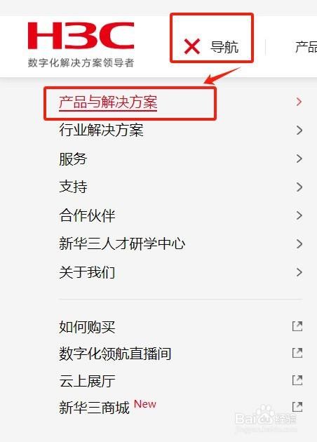 第三步,点击"导航"按钮下的"产物与解决方案"栏。