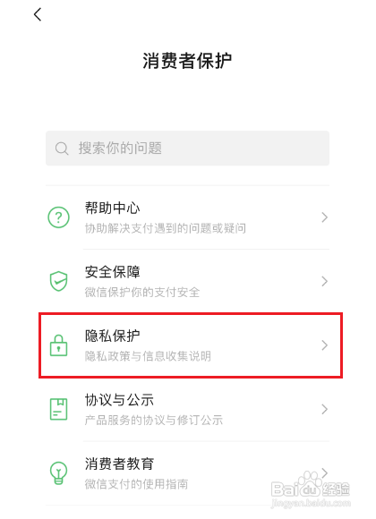 在消用度者掩护界面,点击隐私掩护进入。