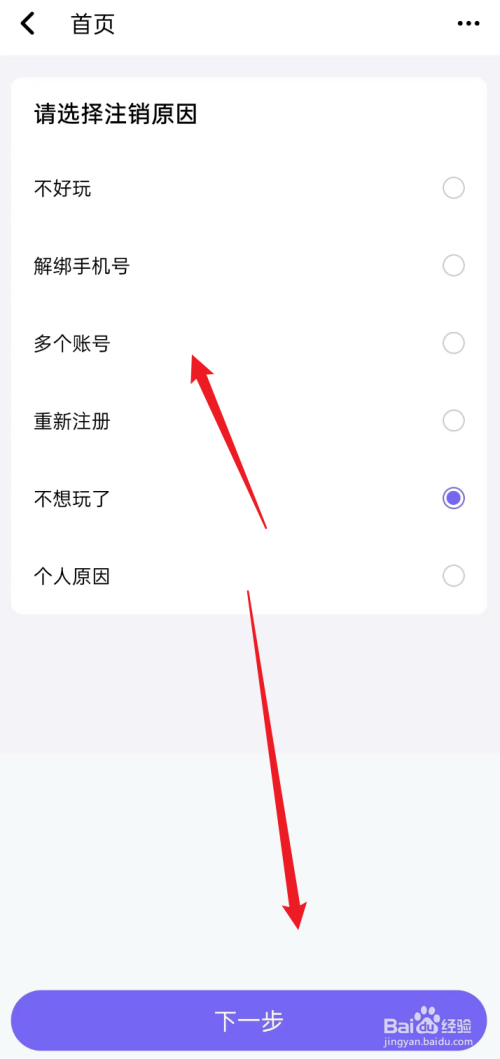 进入到新界面,选中刊出缘故原由,点击下一步按钮。