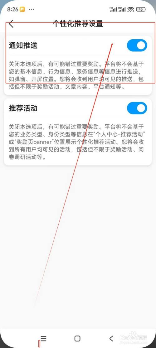在弹出的新界面中点击"通知推送"右侧的按钮