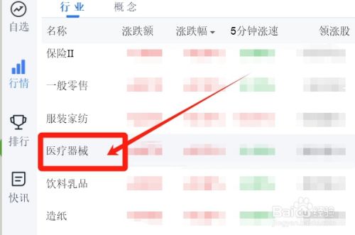 点击【医疗器械】,如图。这样,我们就可以知道医疗器械类股票的行情了。