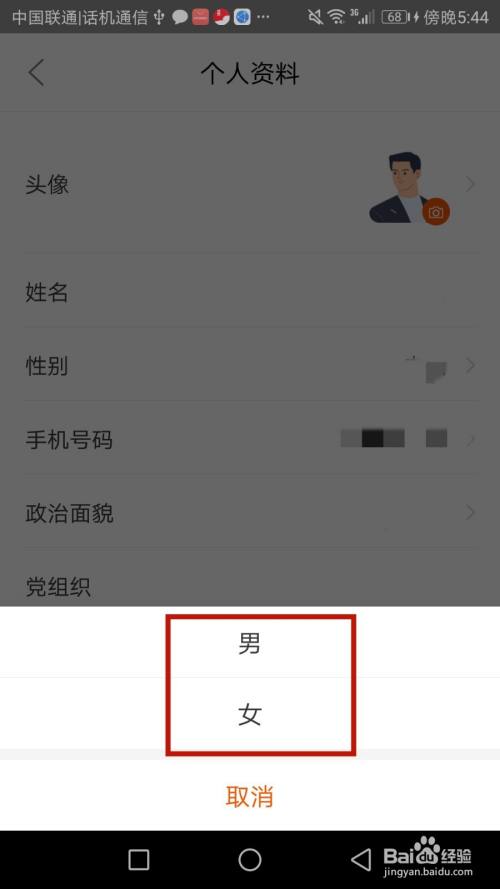 点击箭头指标的目的的"性别"选项