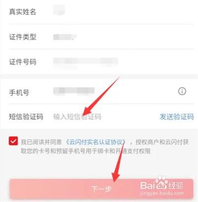 在进入的绑卡页面里输入本身的姓名、证件号码、手机号等内容,再把手机收到的验证码填入后继续勾选下方的"实名认证和谈",点击"下一步"按钮。