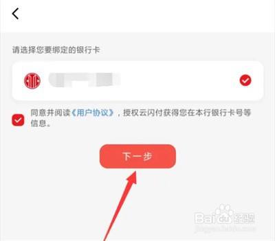 页面跳转后选摘要绑定的银行卡并在"用户和谈"前方的小方块里点击勾选,再点击"下一步"按钮。