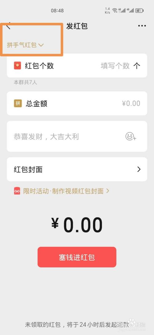 在页面左上角点击拼手气红包