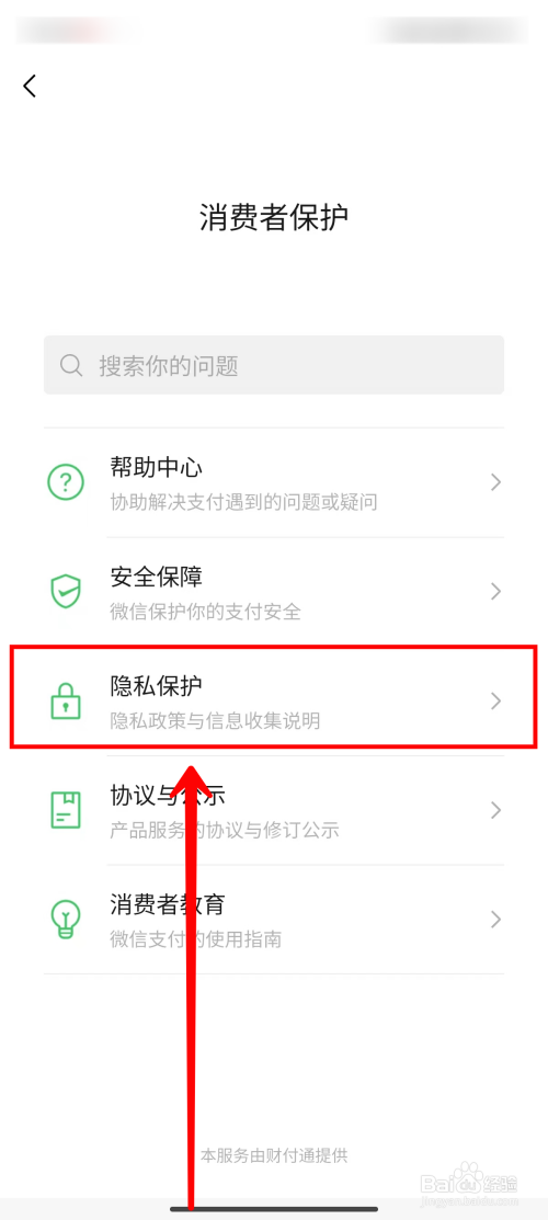 打开消用度者掩护页面,点击【隐私掩护】选项。