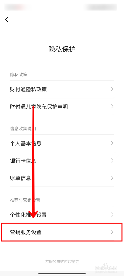 进入隐私掩护页面,点击【营销办事设置】选项。