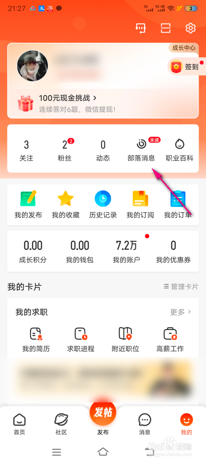 进入个人中间,点击第4个部落动静按钮。