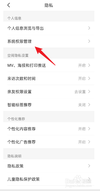 进入到隐私菜单栏中,点击体系权限办理选项。