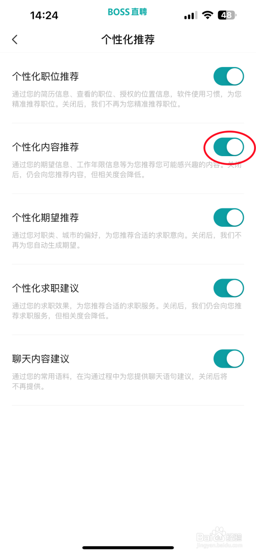 进入个性化保举的页面找到个性化内容保举点击【开关】按钮;