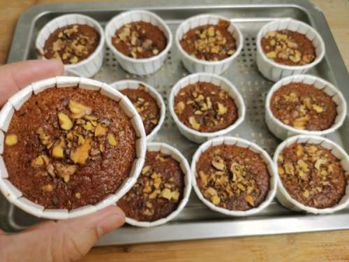 - 5翻拌匀称以后倒入纸杯中九分满,外貌撒上核桃碎装饰一下进烤箱145度烤30-35分钟出炉震几下,无需倒扣,天然放凉即可享用