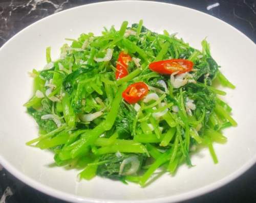 - 4再加叶子炒至段生,加点盐调味,最后倒小虾米拌匀即可