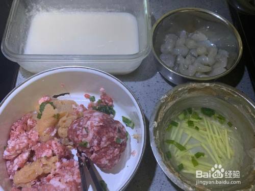 生煎馅:猪肉,虾仁,盐,味精,料酒,葱姜水,胡椒粉,搅拌搅打上劲。
