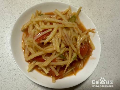 先把土豆削皮切当作丝,然后把西红柿切当作块;