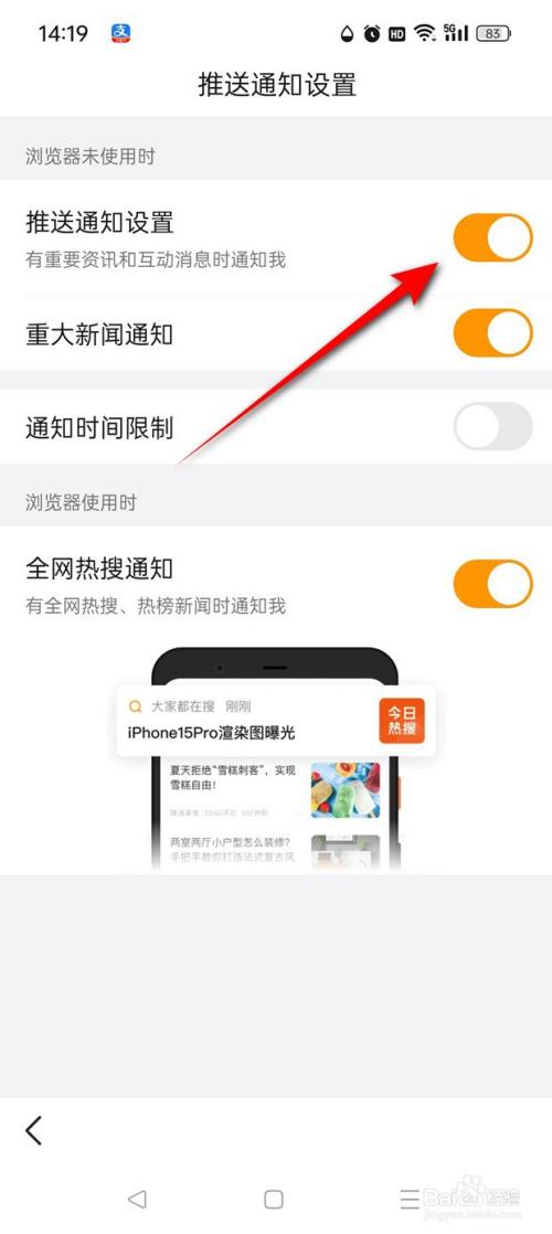 当"推送通知设置"旁的小滑块处于点暗状况时即暗示此时已封闭通知推送功效,点击小滑块。