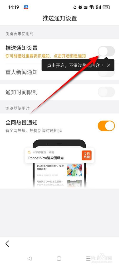 返回,将"推送通知设置"旁的小滑块点亮即可开启。