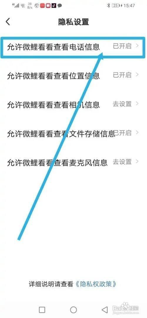 来到隐私设置,然后点击【许可微鲤看看查看德律风信息】。