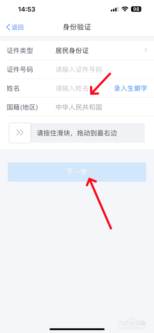 打开本人银行卡验证的页面输入"基本信息"并再选择"下一步"按钮;