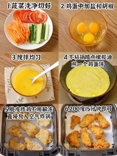 - 1蔬菜洗净切好备用,鸡蛋打散煎当作鸡蛋饼,脆皮炸鸡不消解冻,直接放入空气炸锅200度15分钟