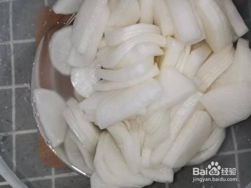 萝卜内里倒入盐,一勺半的盐,先腌五分钟,把内里的水分都腌出来,水倒失备用,不需要再洗萝卜上面的盐,直接留着备用就可以了