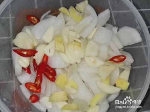 腌好的萝卜内倒入筹办好的小米辣,姜,蒜