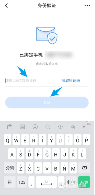 进入到身份验证界面,获取并输入手机验证码,点击验证按钮。