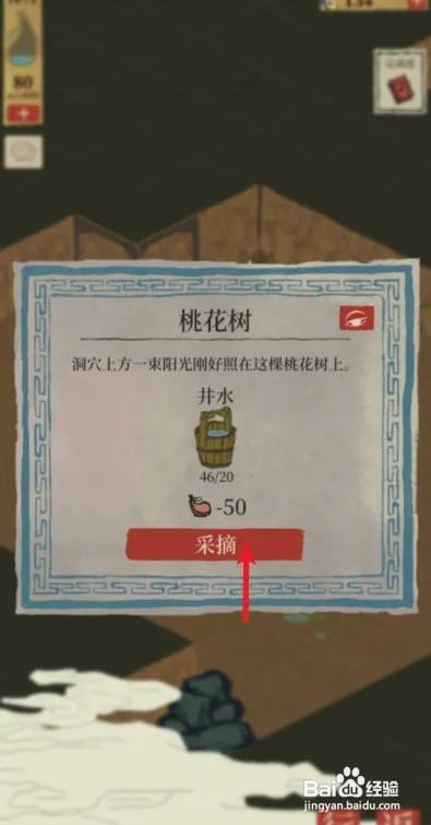 在阴冷的岩穴里用【井水】在桃花树上采摘。