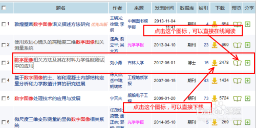 在论文显示列表中,找到要下载的论文标题,在标题右侧,有两个图标,可以直接点击响应的图标举行"下载"或是"在线阅读"。
