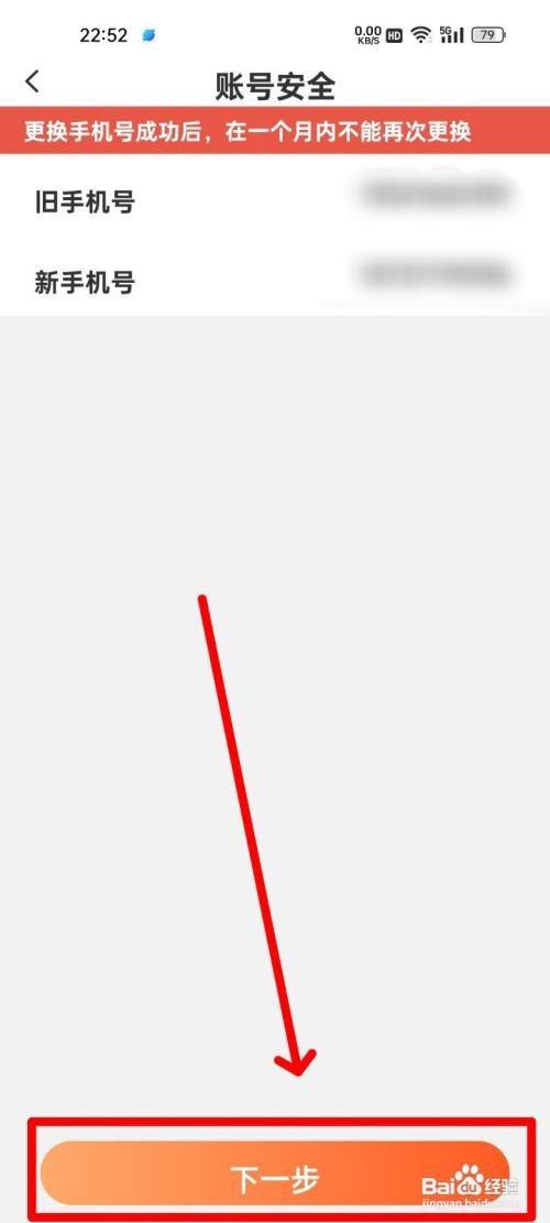步调七,输入旧手机号与新手机号后点击"下一步"。