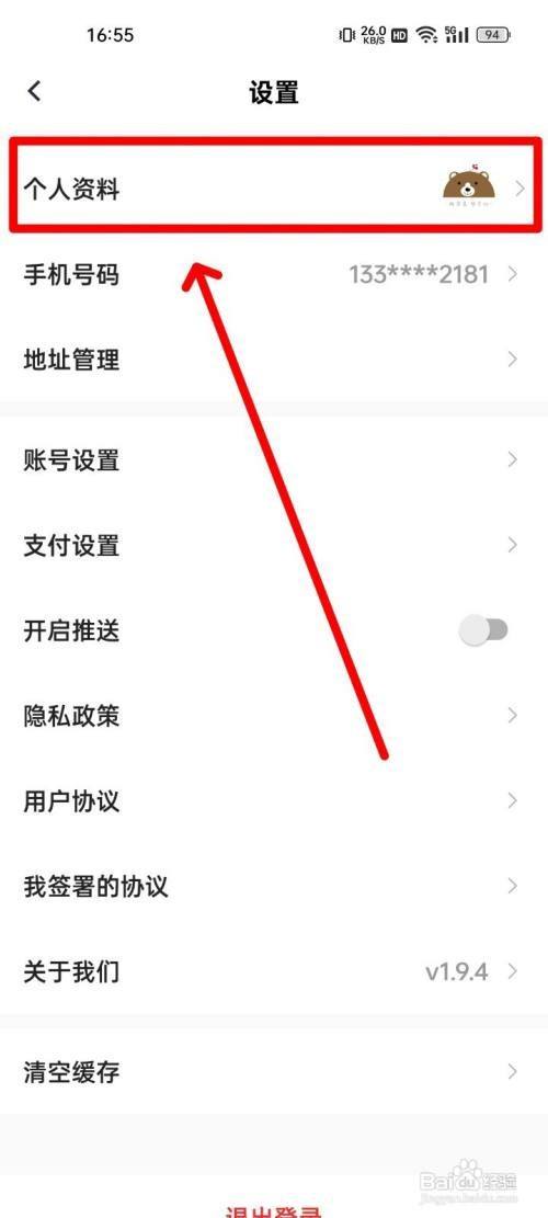 步调四,在设置页面点击"个人资料"。