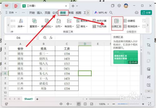 切换到【数据】选项卡,点击【分级显示】栏中的【分类汇总】。