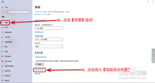 在设置页面点击【屏幕】选项,在屏幕选项下点击进入【高级显示设置】。