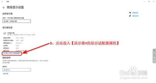 在高级显示设置页面点击进入【显示器1的显示适配器属性】。