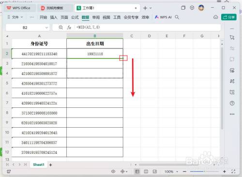 然后同时按下ctrl+e键,体系会主动提取各个身份证中的日期完当作填充。