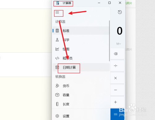 在打开的计较器窗口,如下图所示,选择"日期计较"。