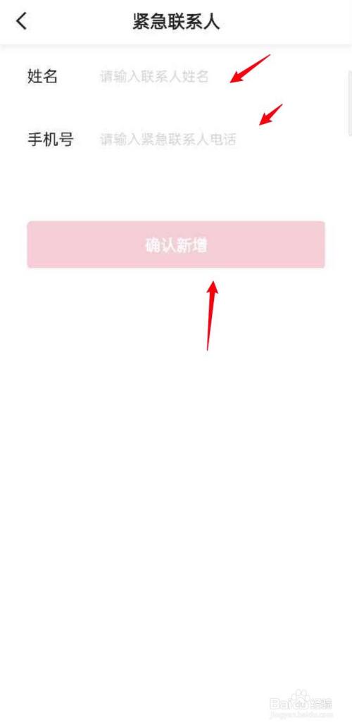 进入到紧急接洽人界面,输入姓名、手机号,点击确认新增按钮,即为新增完毕。