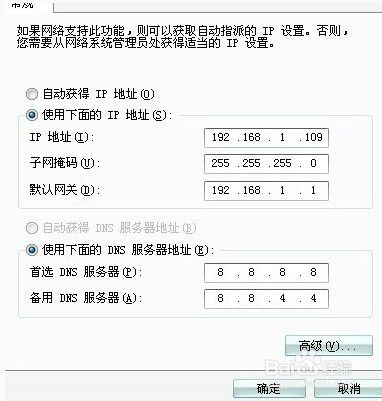 然后依次输入IP地址、子码掩码、默认网关、首选DNS办事器、备用DNS办事器的地址。