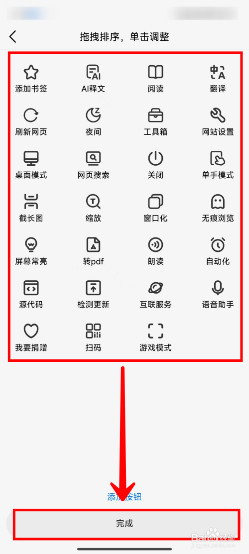 然后在打开的页面中,拖拽【菜单图标】举行排序调解,然后点击【完当作】即可。